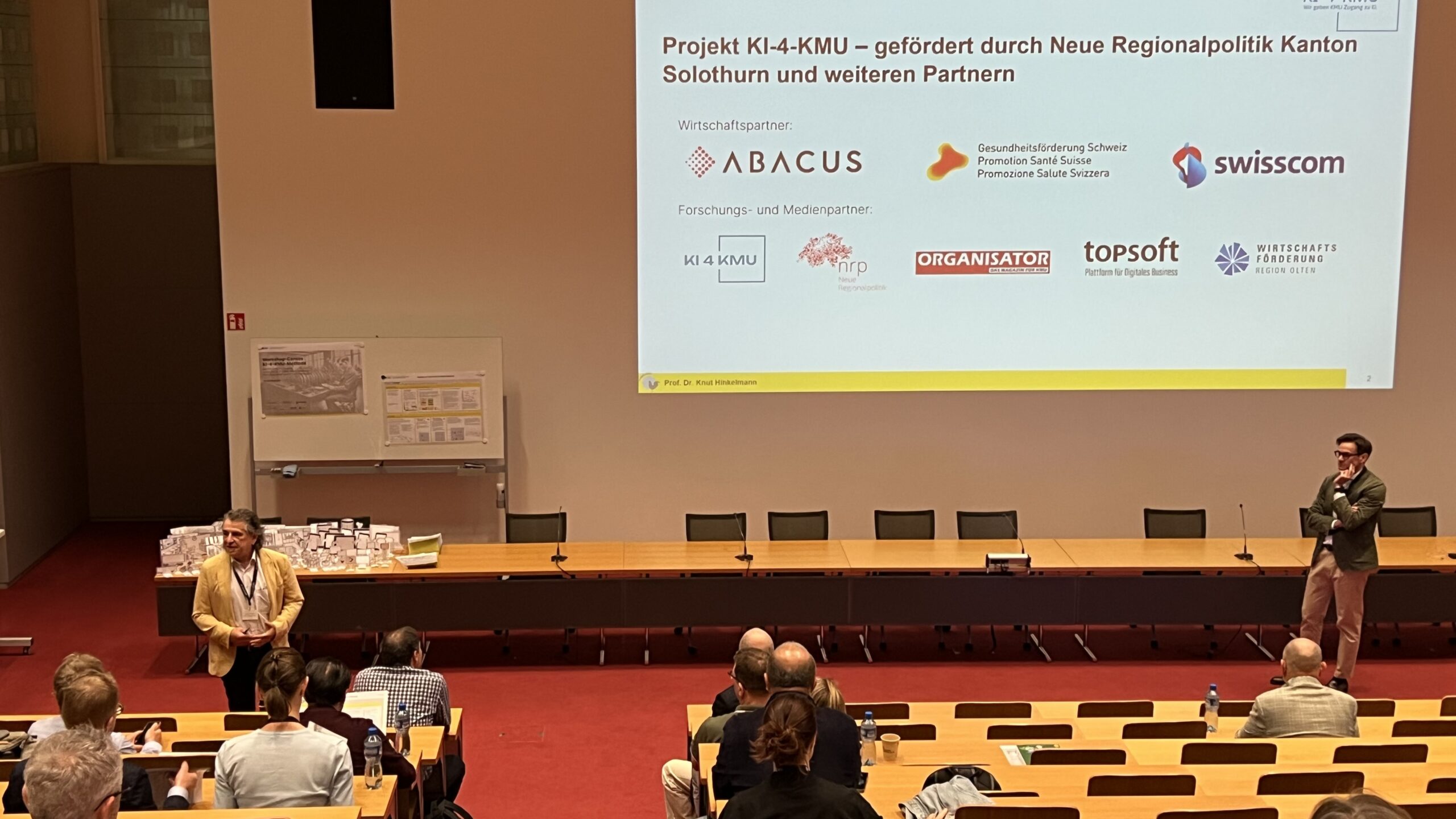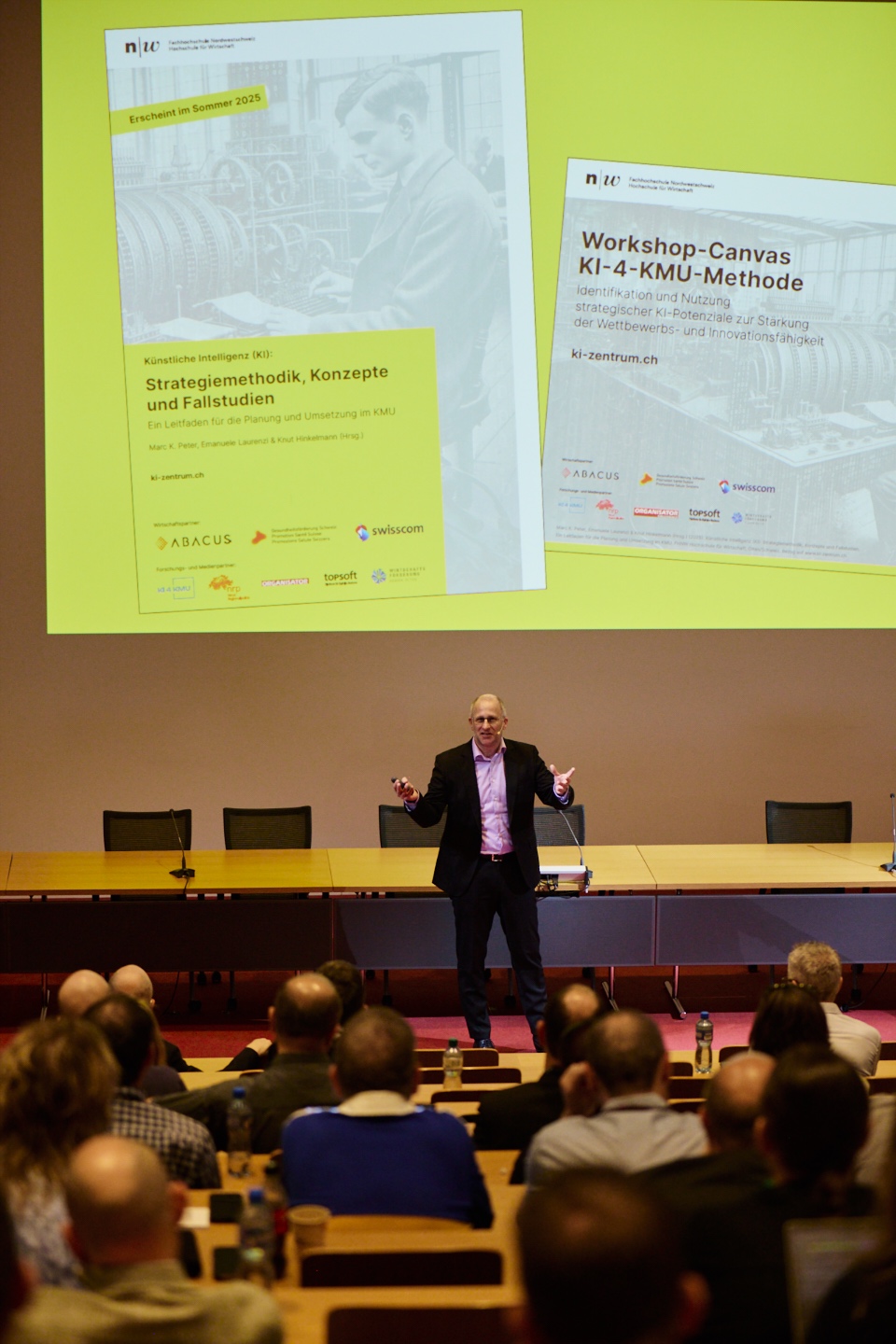 Am 14. Mai 2025 präsentierte das Forschungsteam der FHNW Hochschule für Wirtschaft in einer Pilotdurchführung den KI-Workshop-Canvas „KI-4-KMU“ am Abacus Intelligence Day auf dem FHNW-Campus Brugg-Windisch mit 120 Teilnehmenden aus Schweizer KMU.