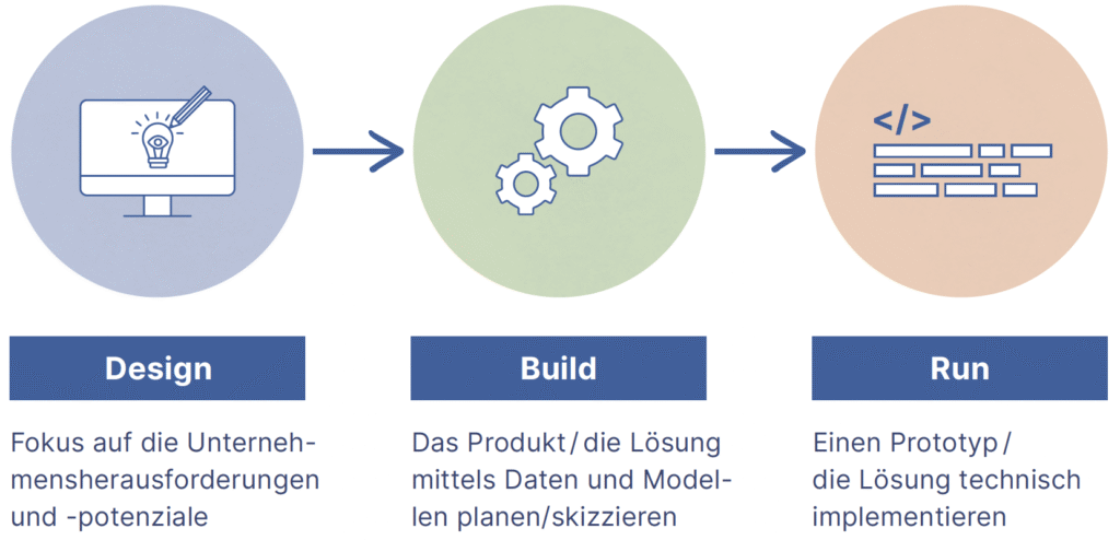 Die FHNW Forschungsgruppe Intelligent Information Systems hat die Design Thinking-Methode im Hinblick auf eine KI-Methodik in drei Phasen (nach den Grundsätzen des «Human Centered Design» nach BMGF (2015) und IDEO (2015)) zusammengefasst (vgl. Abbildung):